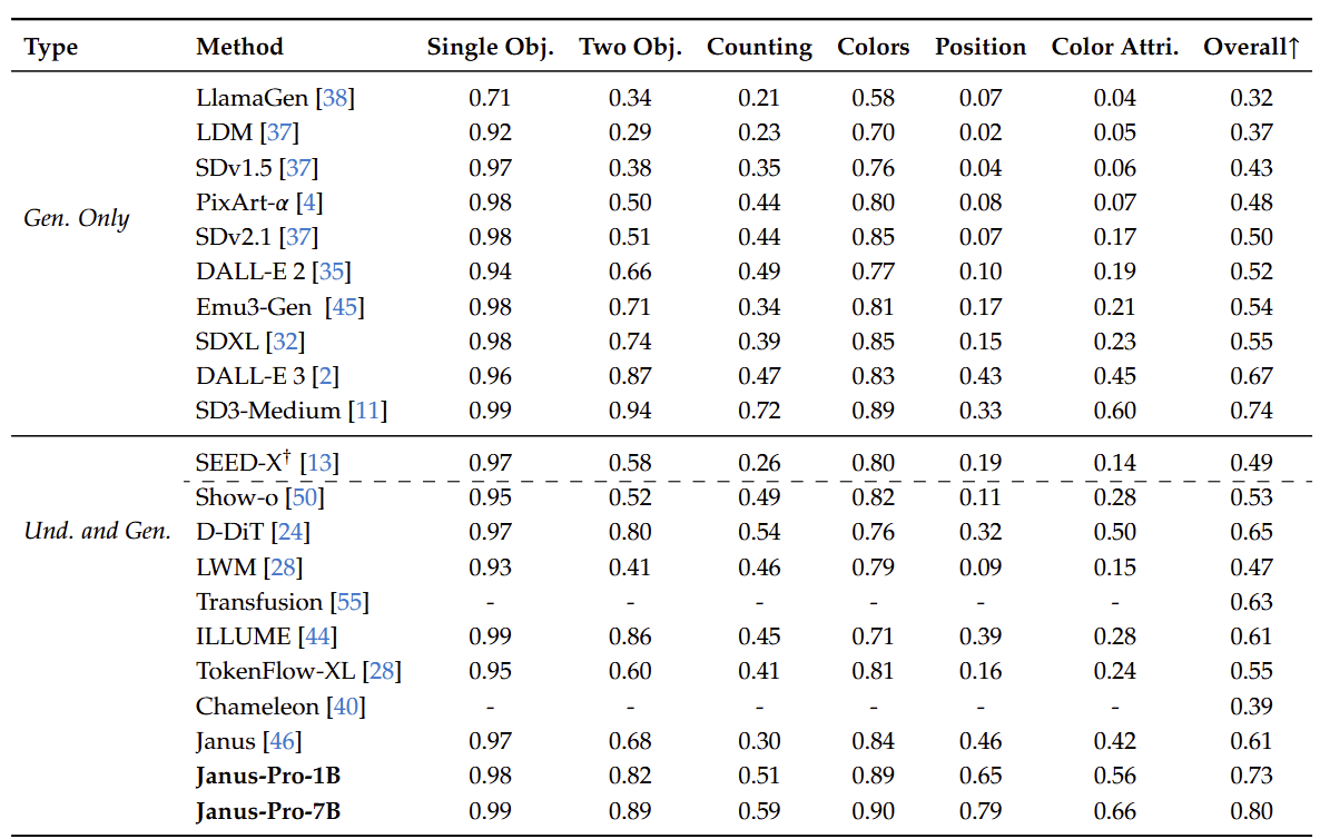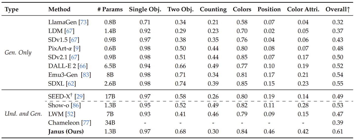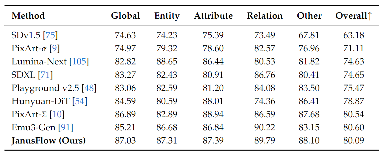 下图比较了 DPG-Bench 的结果。除了 JanusFlow 外,其他模型都是专门做生成的。