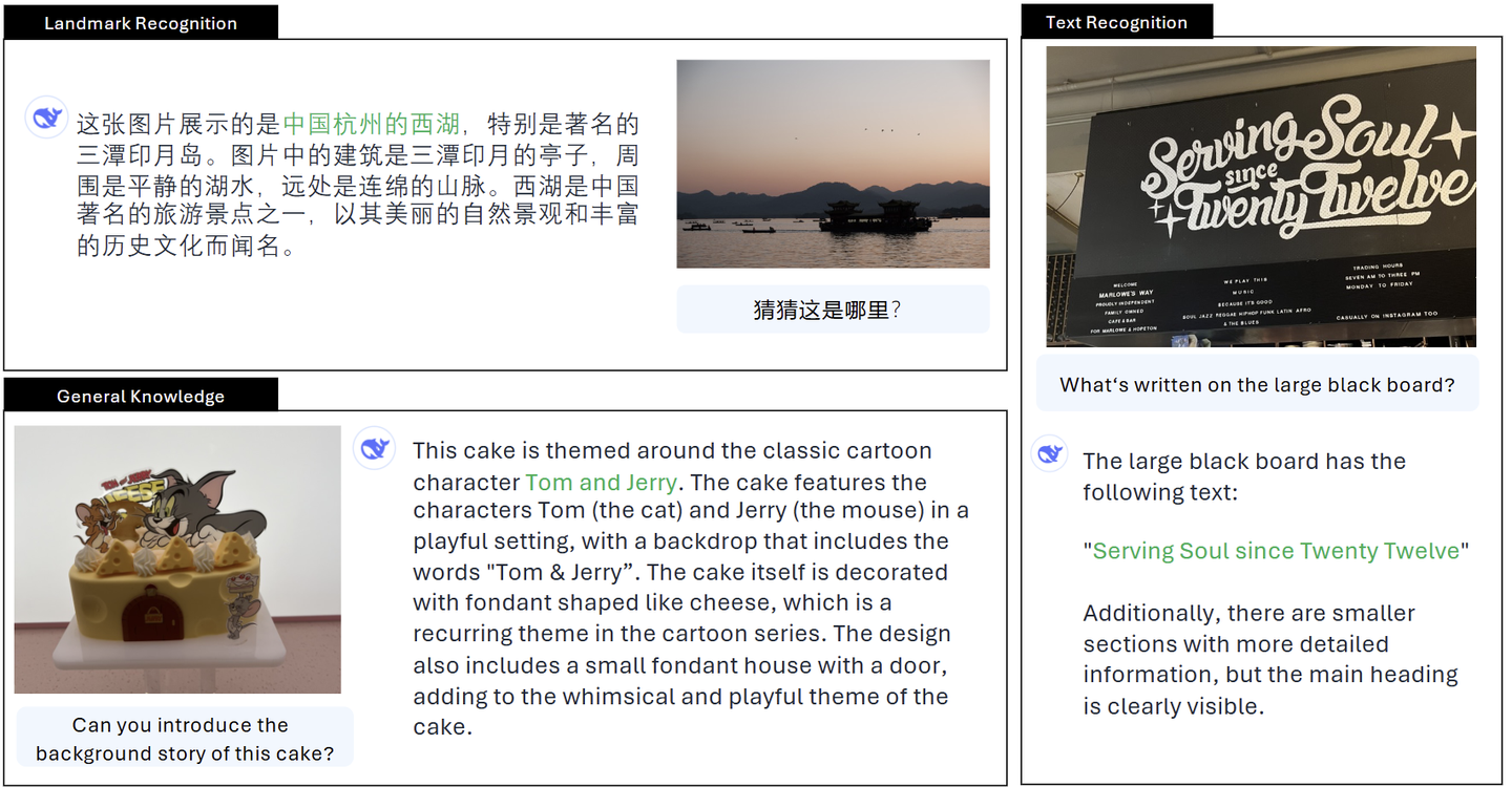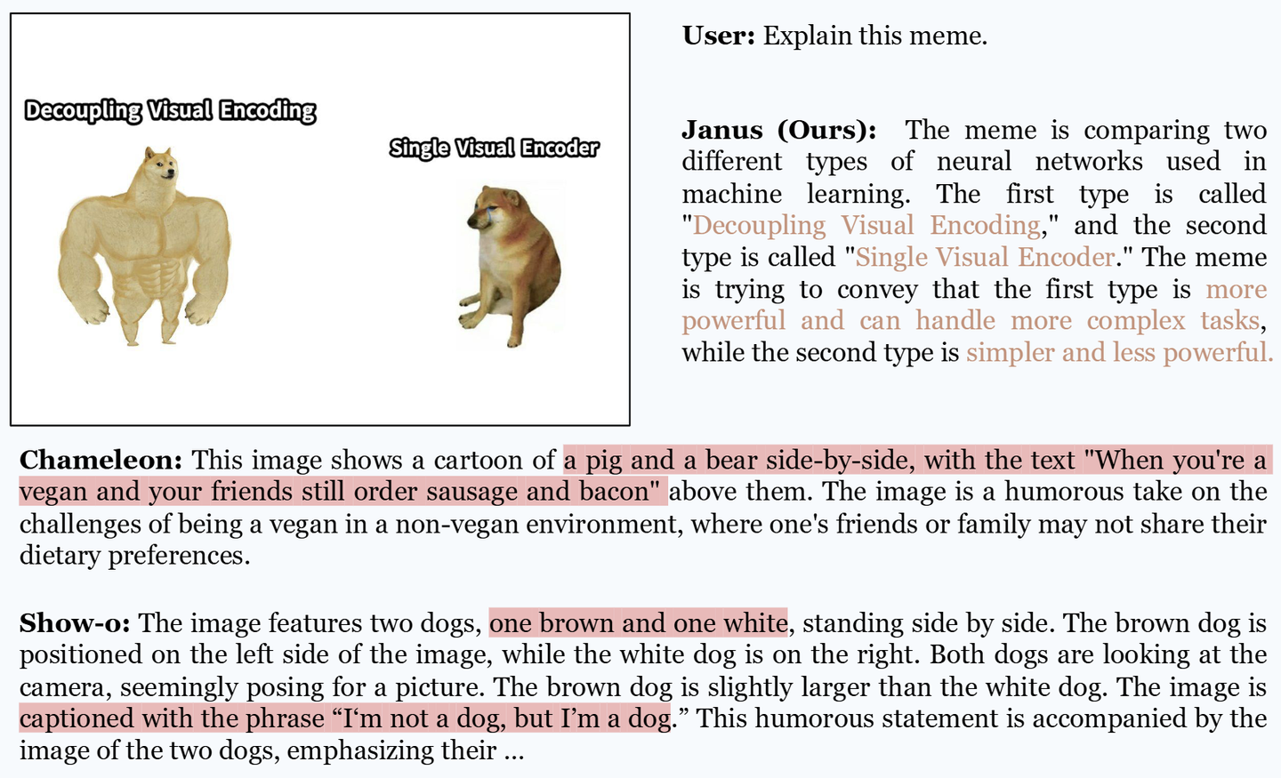 下图显示了 Janus 多模态理解能力的定性结果,与 Chameleton 和 Show-o 相比。Janus 准确地解释文本标题并捕获记忆中传达的情感。相比之下,Chameleon 和 Show-o 都难以准确识别图像中的文本。此外,Chameleon 无法识别 meme 中的对象,而 Show-o 误解了狗的颜色。这些示例强调,与 Chameleon 和 Show-o 使用的共享编码器相比,解耦视觉编码器显着提高了 Janus 的细粒度多模态理解能力。