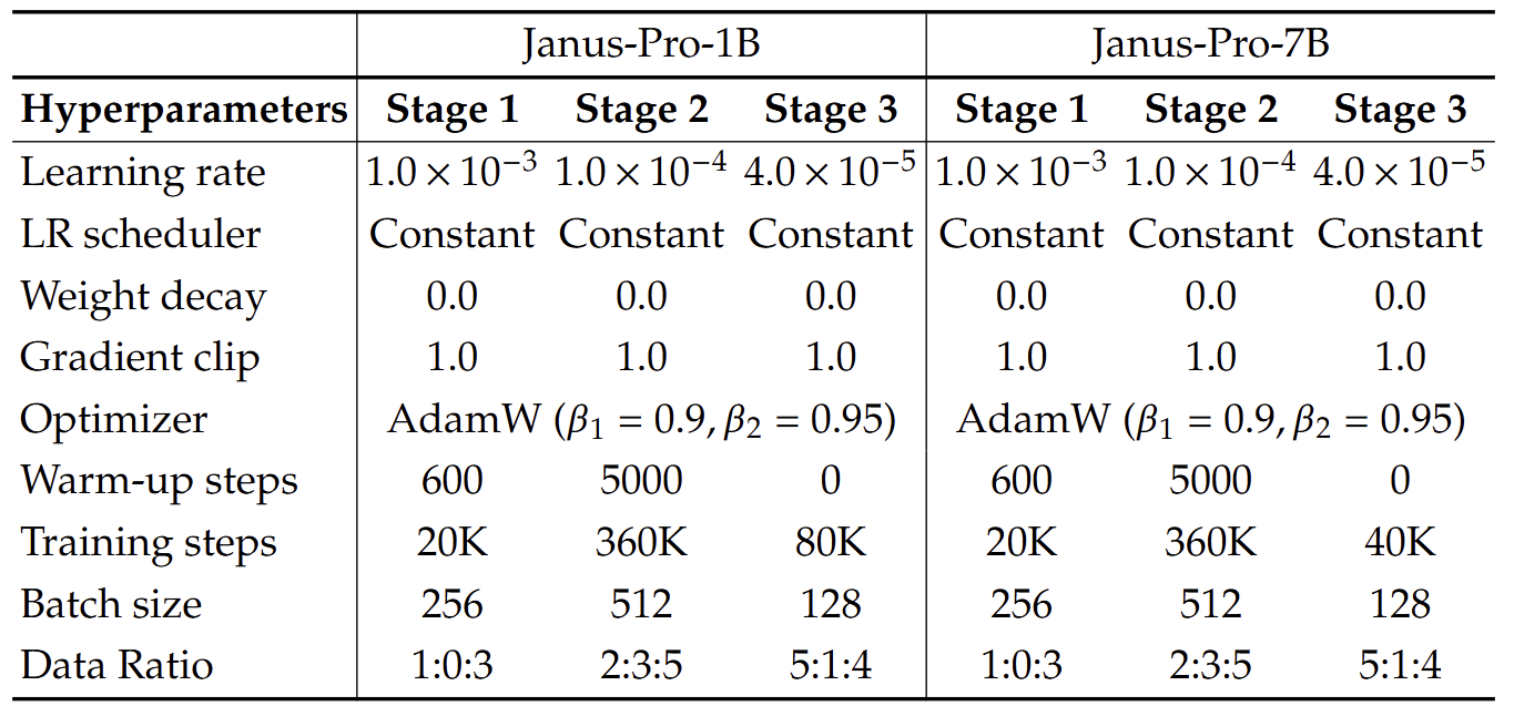 作者利用最大支持序列长度为 4096 的 DeepSeek-LLM (1.5B 和 7B) 作为基础语言模型。对于理解任务中使用的视觉编码器,选择 SigLIP-Large-Patch16-384。生成编码器有一个大小为 16,384 的 codebook,并将图像下采样 16 倍。Understanding Adaptor 和 Generation Adaptor 都是 2 层的 MLP。每个阶段的详细超参数如下图所示。所有图像都被调整为 384×384 像素。