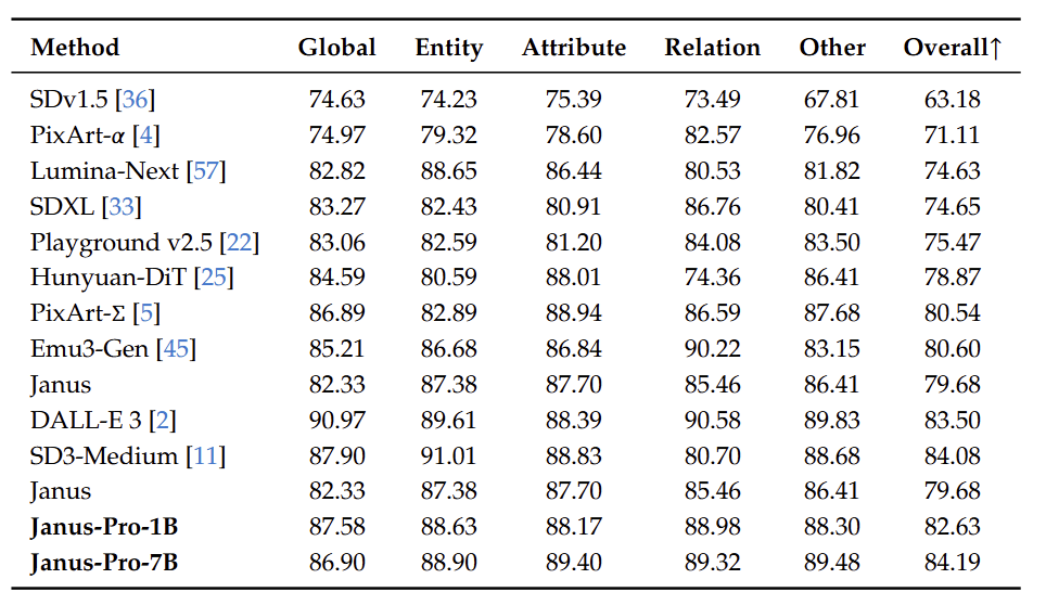 Janus-Pro 在 DPG-Bench 上得分为 84.19,超过了所有其他方法。这表明 Janus-Pro 擅长遵循文生图的密集指令。