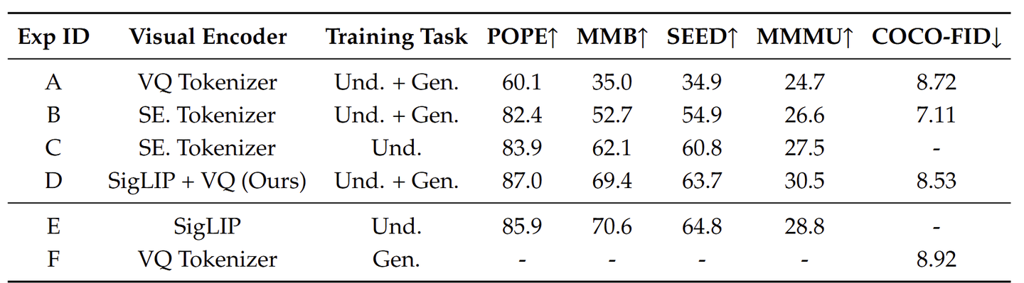 有一个消融实验的细节值得注意,即如图 7 所示。Exp-D 为 Unified Training,Exp-E 相当于是训练了一个纯理解模型,Exp-F 相当于是训练了一个纯生成模型。对于纯理解模型,作者省略了视觉生成数据;对于纯生成模型,作者省略了理解数据。注意,统一训练和纯理解训练对于理解部分遵循相同的步骤,统一训练和纯生成训练对于生成部分遵循相同的步骤。实验结果表明,Unified Training 的性能与 Pure Understanding 或 Pure Generation 的训练相当。这表明 Janus 能够结合强大的生成能力,同时最低限度地影响多模态理解性能。