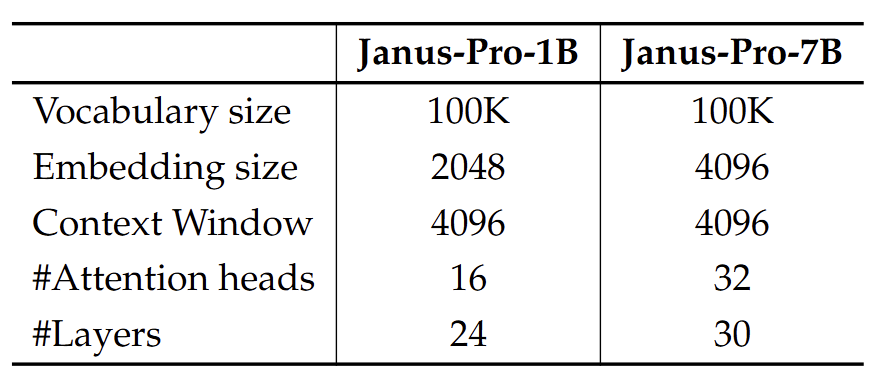 先前版本的 Janus 使用 1.5B LLM 验证了视觉编码解耦的有效性。在 Janus-Pro 中,作者将模型缩放到 7B,1.5B 和 7B LLM 的超参数如图 10 所示。作者观察到,当使用更大规模的 LLM 时,与较小的模型相比,多模态理解和视觉生成的损失收敛速度显著提高。这一发现进一步验证了这种方法的强大可扩展性。