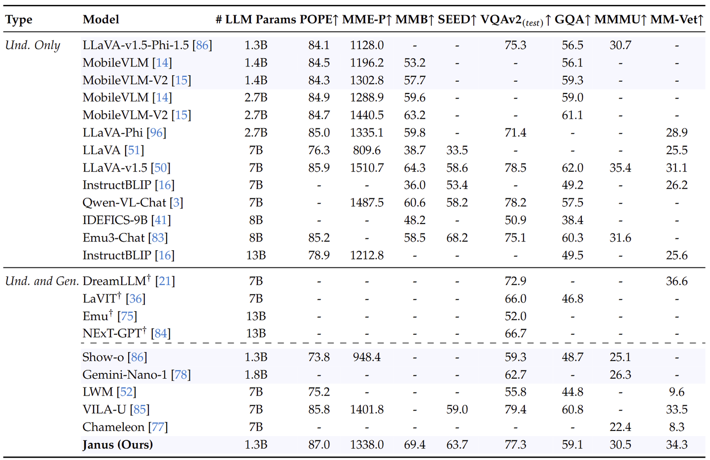 - Janus 减轻了源自多模态理解和生成的不同粒度需求的冲突,并消除了在选择视觉编码器时需要在 2 个任务之间进行权衡的需要。