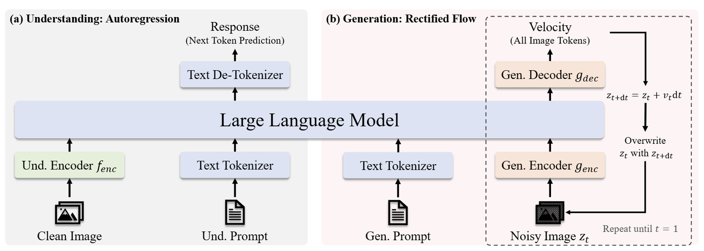 Janus 是使用一个统一的 Transformer 架构来统一多模态图像理解和多模态图像生成任务的模型。JanusFlow 是 Janus 的后续版本,一个统一多模态模型,将 Rectified Flow 与 LLM 架构无缝集成。