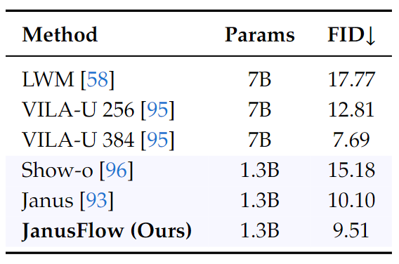 下图比较了 MJHQ FID-30k 的结果。采样的图片是使用 CFG factor \(w=2\) ,sampling steps 为 30 生成的。结果表明,Rectified Flow 能够在 Janus 等自回归模型上提高生成图像的质量。