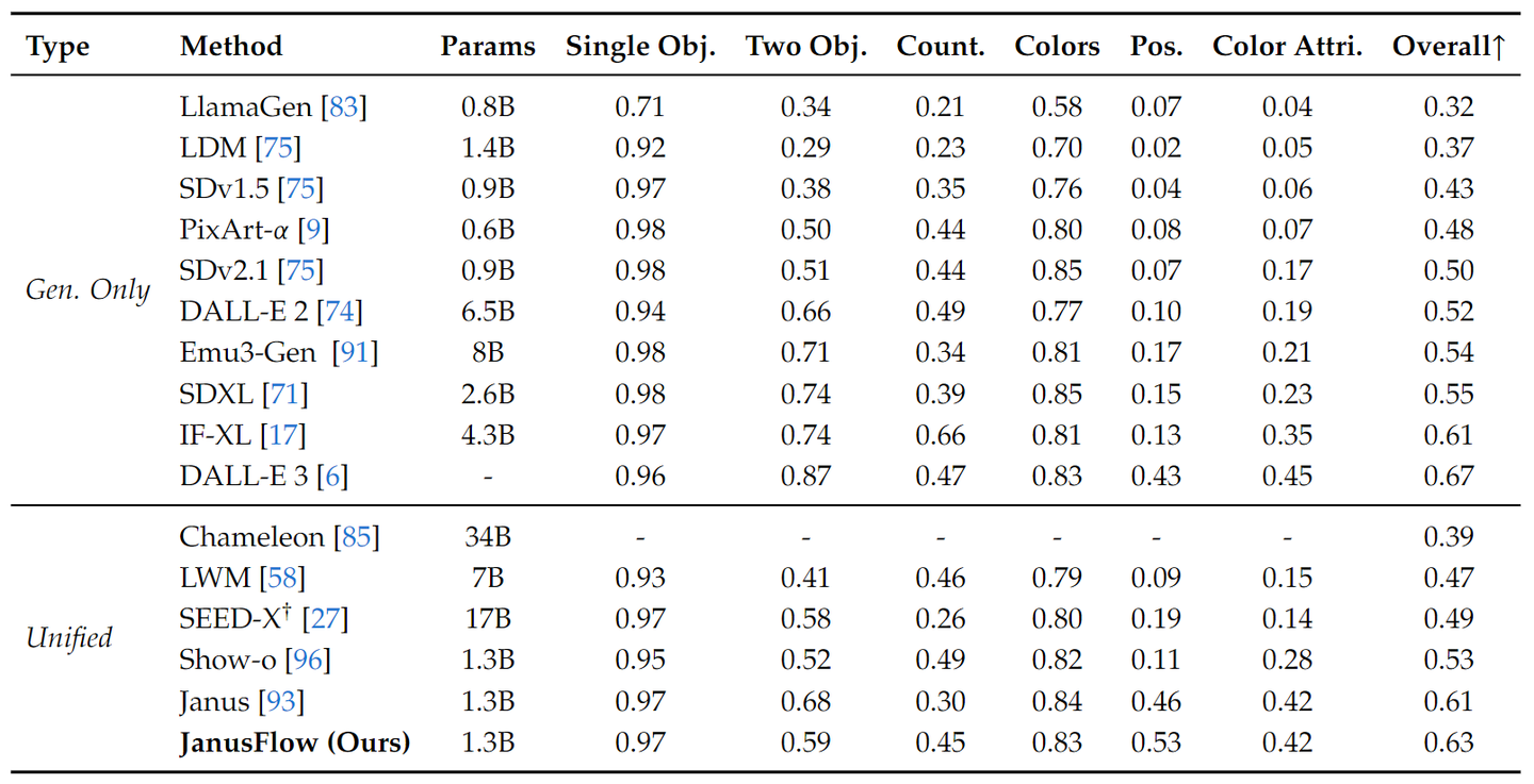 作者报告了 GenEval、DPG-Bench 和 MJHQ FID-30k 的性能。下图比较了 GenEval,包括所有子任务的分数和总分。JanusFlow 的总体得分为 0.63,超过了之前的统一框架和几个生成特定模型,包括 SDXL 和 DALL-E 2。