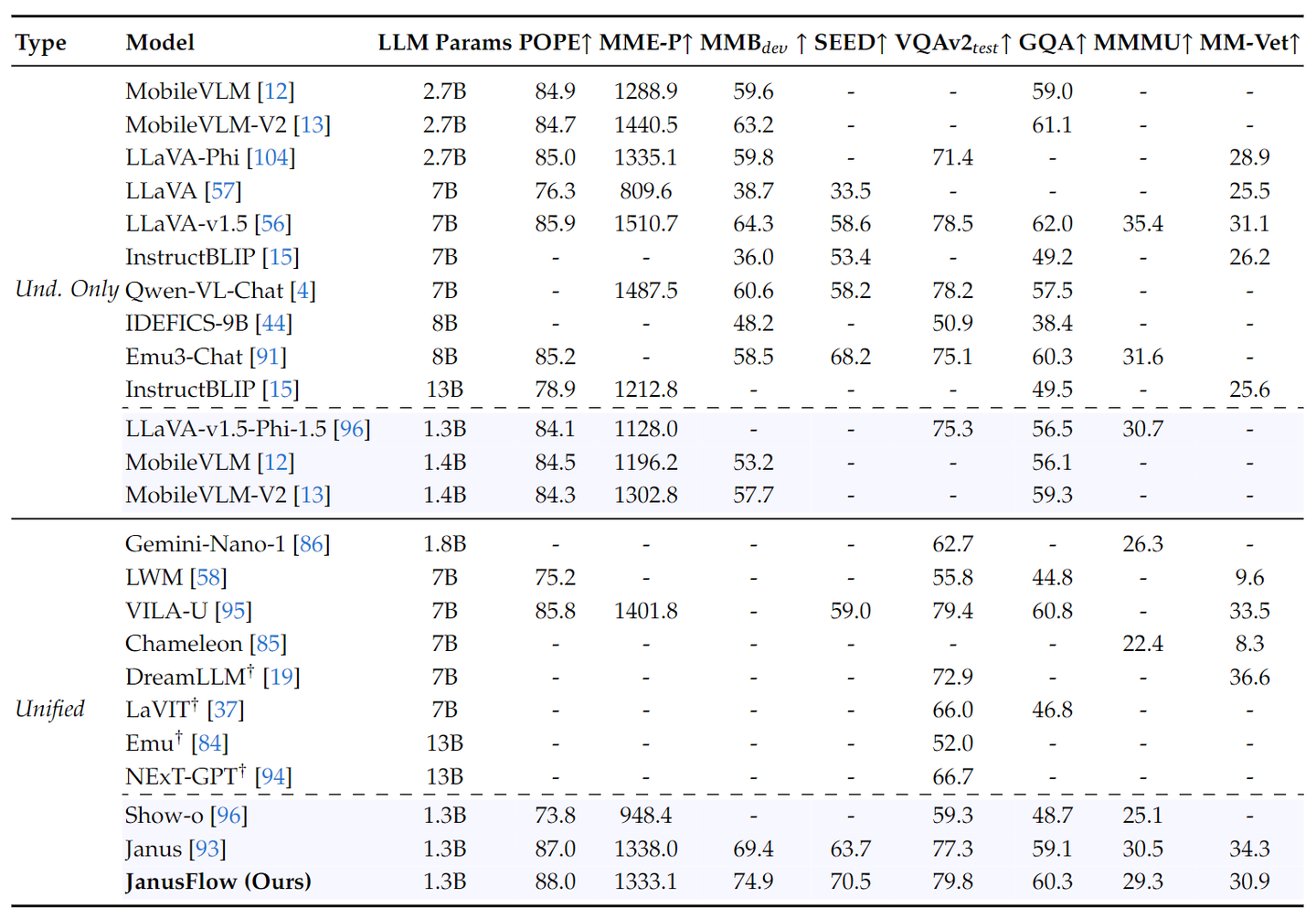 下图展示了 JanusFlow 与其他方法的比较,包括专门做理解的模型和 Unified Model。JanusFlow 在具有相似参数量的所有模型中达到了最佳性能,甚至超过了多个专门做理解的方法。结果表明,JanusFlow 协调了自回归 LLM 和 Rectified Flow,在理解和生成方面都取得了令人满意的性能。