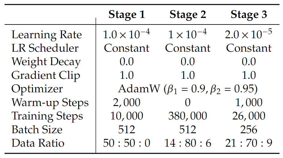 这个阶段训练整个模型,除了理解编码器和 VAE Encoder。训练结合了 3 种数据类型:多模态理解、图像生成和纯文本数据。作者最初分配更高比例的多模态理解数据来建立模型的理解能力。随后,增加了图像生成数据的比例,以适应基于扩散的模型的收敛要求。