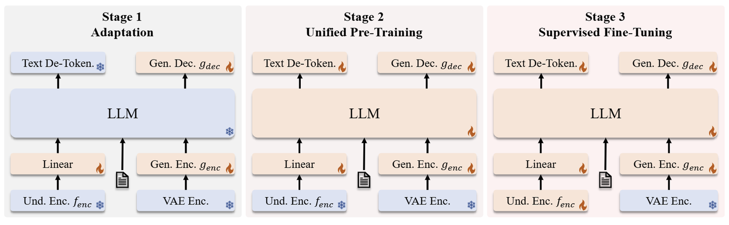 这一阶段的主要目标是训练 Linear 层 (\(f_{enc}\)之后的东西,可以理解为 Adaptor),Generation Encoder,Generation Decoder。这一阶段旨在使这些新的模块与 Pre-trained 的 LLM 和 SigLIP Encoder 有效适配。